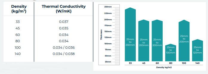 The CCL slab range is available in thicknesses from 25mm to 200mm in 5 mm increments and in densities from 33 kgm³ to 140 kgm³ as standard.